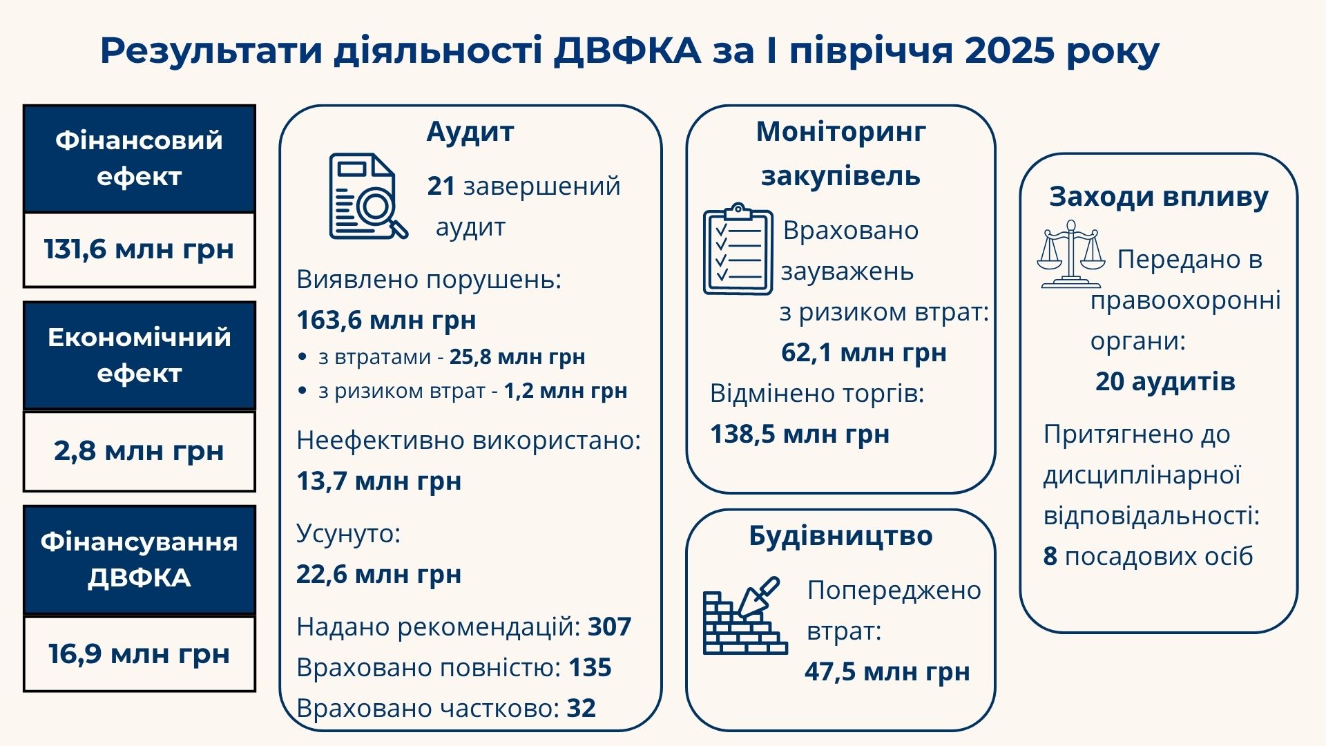 За перше півріччя 2025 року, завдяки врахуванню рекомендацій Департаменту, вдалося заощадити та повернути 131,6 млн грн комунальних ресурсів (фінансовий ефект) та усунути порушення, що не призвели до втрат або отримати вигоду від рекомендацій у майбутньому на 2,8 млн грн (економічний ефект) у порівнянні з фактичним фінансуванням Департаменту 16,9 млн грн.